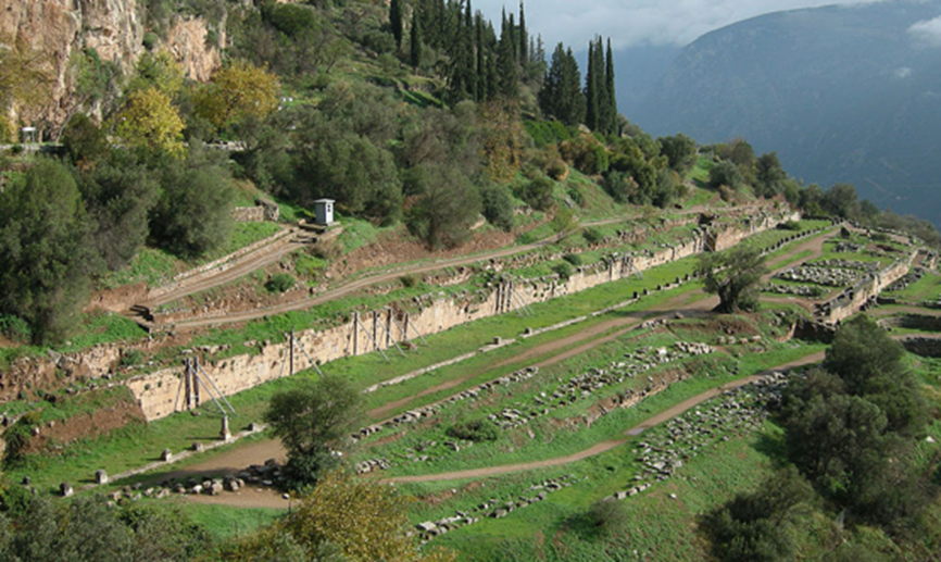 Todo el sitio está construido sobre una ladera empinada del monte Parnaso (2.457 m de altitud), el lugar donde se decía vivía Apolo con las Musas.